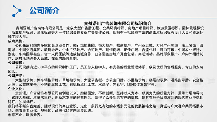 20余年的實戰考驗,20余年的勵精圖志,公司逐步發展壯大,成為黔中大地經驗富足、實力強大的專業廣告設計制作安裝公司。現有畢節、大方、貴陽和興義分公司,下設貴陽市廣告標識加工廠、七星關服務總部、貴陽運營、大方綜合服務部和興義分公司,公司發展擁有20多名員工,設計、加工、安裝、銷售一站式服務,技術團隊專業,生產程序嚴格規范,后期服務貼心,擁有一系列先進加工設備,完全具備高難度廣告制作安裝的經驗和水準,在各類廣告產品的設計制作、安裝施工等方面有著獨特的表現。公司年收入壹仟萬圓,有雄厚的資金和技術支持,公司始終如一,面向客戶提供優良、快捷的廣告制作安裝服務,二十余年的市場搏擊贏得了客戶的一致好評。